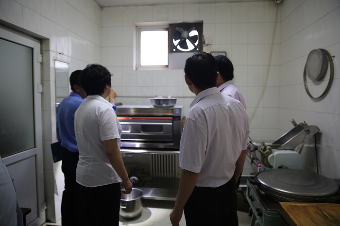 檢查人員來到公司食堂檢查用餐環(huán)境、餐桌、餐具、灶臺、儲物間等衛(wèi)生質(zhì)量,并針對蚊蠅、防鼠設(shè)施、地漏、排風(fēng)口等易造成微生物滋生的地方做重點檢查,提出改進措施。