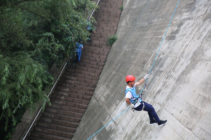 大壩速降屬極限挑戰(zhàn)項目,要求參與者穿戴好各項安全防護(hù)措施后,抓住繩索從一座高度為50米的大壩上攀巖而下,降落點在壩下平地,可體驗速降的刺激與驚險。員工們挑戰(zhàn)自身心理極限,感悟團隊支持的力量,踴躍參加,重塑員工堅韌不拔的品質(zhì)。