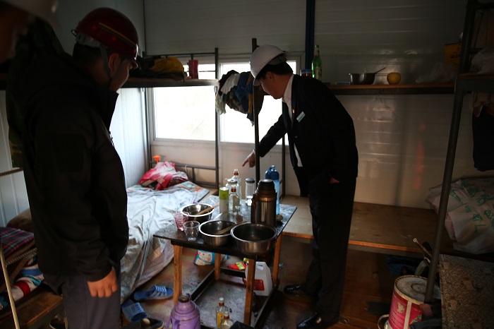 檢查組聯(lián)合鎮(zhèn)安全生產(chǎn)辦公室工作人員檢查了021項目各總包單位食堂及工人宿舍安全防范情況。在021項目,檢查出了應急燈插線板未接通;工人宿舍煙頭亂扔;宿舍逃生通道阻塞;日常垃圾隨意堆放等情況,并召開工作會,要求各總包單位連夜整改。